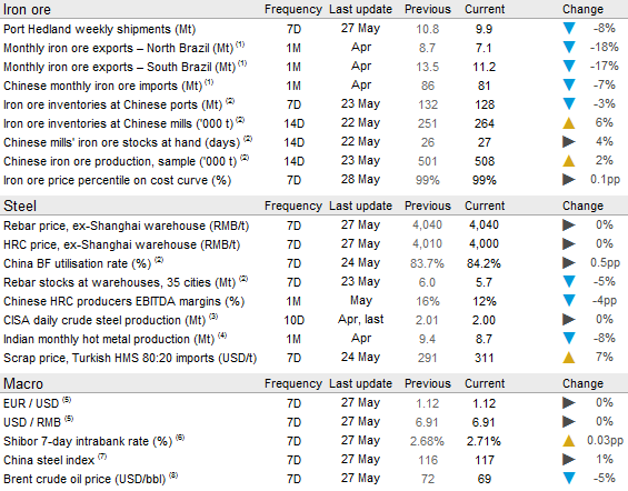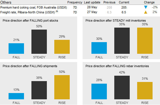 Seaborne supply outside of Minas Gerais is recovering. Supply from Port Hedland, although falling w/w, is still at a high level and registered 9.9 Mt in the past week. FMG’s shipments have been particularly strong. The company shipped at an annualized rate of 164 Mt/y in April and 173 Mt/y thus far in May. BHP has also performed well and shipped at 283 Mt/y for the two months combined. In Vale’s Northern System, shipments have recovered after the heavy rain in March and April. Recent trade data shows that shipments in the second half of May have been at the highest level this year. In addition, Rio Tinto is now shipping at full capacity from both its Cape Lambert and Dampier ports.