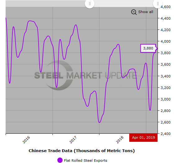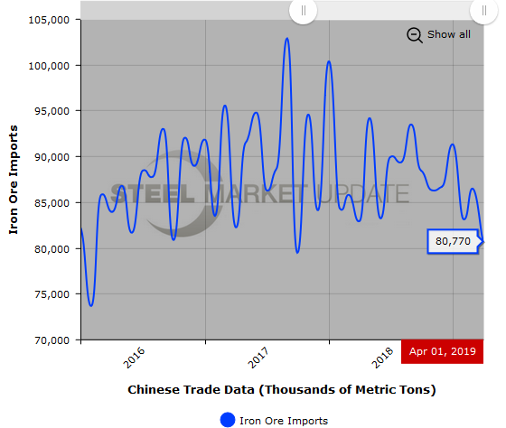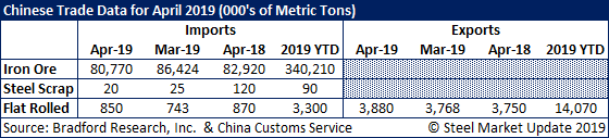 Chinese steel trade data was recently released for the month of April 2019, providing updated data on iron ore imports, scrap imports, and flat rolled imports and exports.