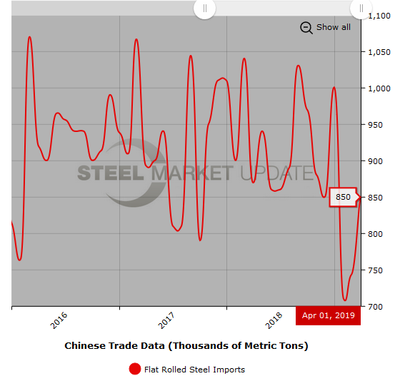 Flat rolled imports to China in April were 850,000 metric tons, up 14.4 percent over the dip in the previous month, but down 2.3 percent over April 2018 figures. Total 2019 imports year to date were adjusted to 3,300,000 metric tons. The same period in 2018 was slightly higher at 3,820,000 tons.