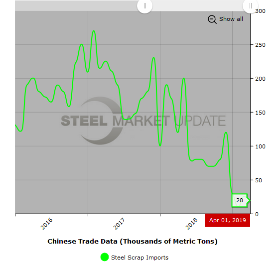 Chinese imports of steel scrap in April totaled 20,000 metric tons, down 20.0 percent over March, and down 83.3 percent over the same month one year ago. Steel scrap imports into China in the first four months of 2019 totaled 90,000 metric tons, down significantly compared to the 580,000 tons imported in the same time frame in 2018.