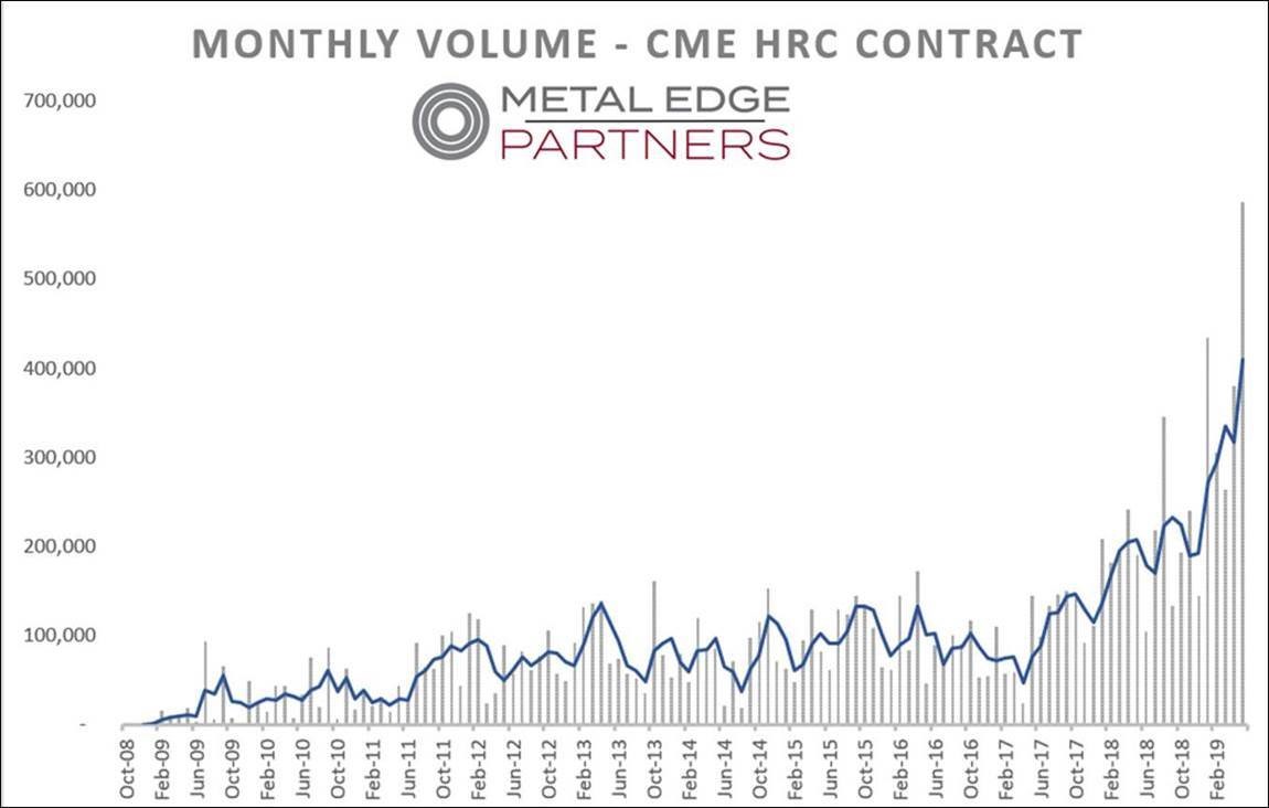 HRC Futures have seen a very active past few weeks (chart below). There are many trying to manage their steel exposure. There are participants hedging inventory risk, OEMs locking in forward pricing, traders rolling their short positions forward, etc. As uncertainty grows, there are manufacturers and stockists prudently reducing their naked long (or short) exposure.