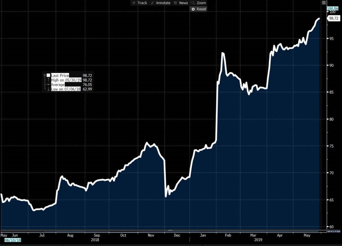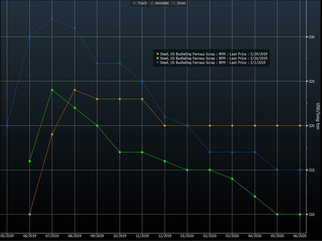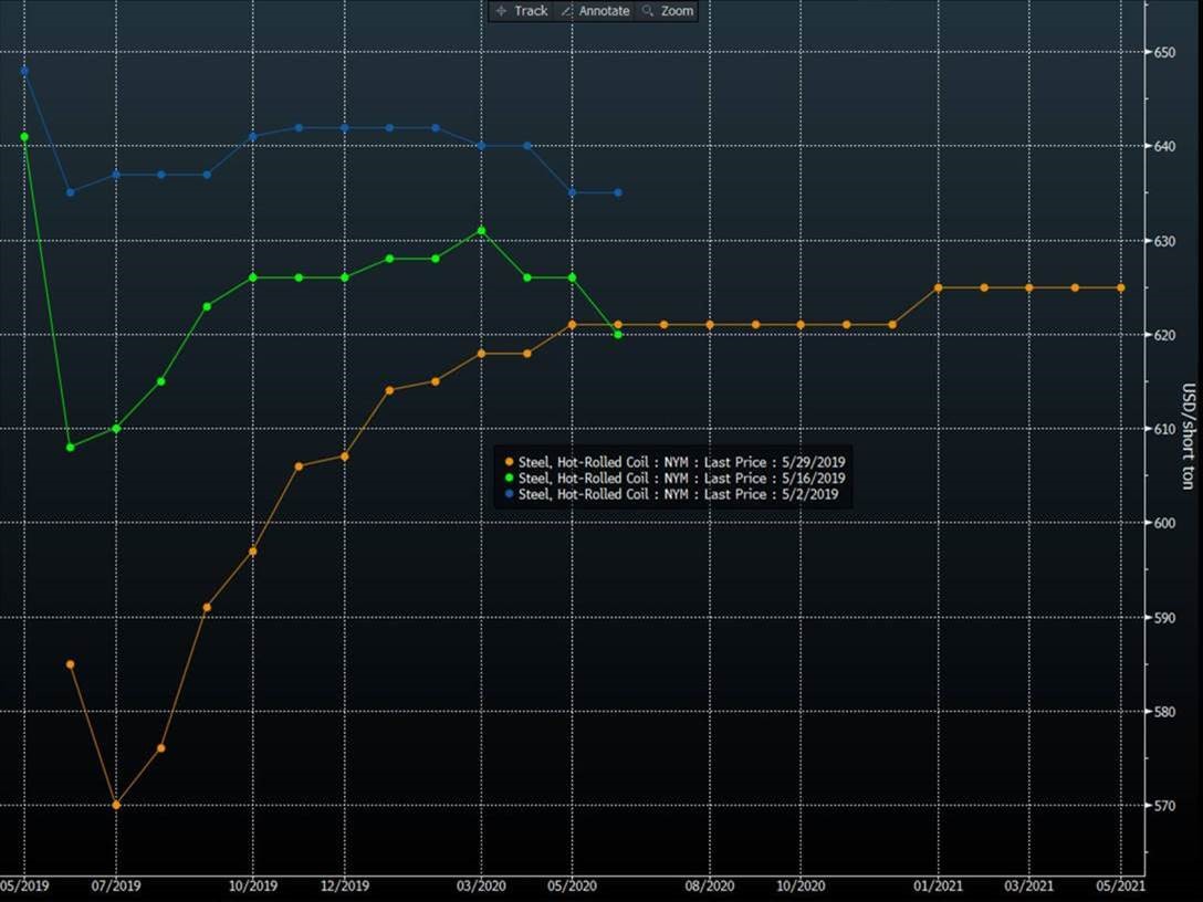 In these four weeks, the picture on the shape of the curve has changed remarkably. The Q3 ’19 has lost considerable value as pressure on physical prices remains high. In a market with falling index level, the buyers of M-2 (July) are asking for a heavy discount! They anticipate further drops in the benchmark index. From the beginning of May to now the July contract has shaved over $60. This has pushed the curve into a steeper carry (contango) than just two weeks ago. The contango is reflective of near-term aggression in spot HRC prices, but also reflects the relative lack of offers for months further out. I call it the “tail of hope” where the market prices an expectation of a rebound.