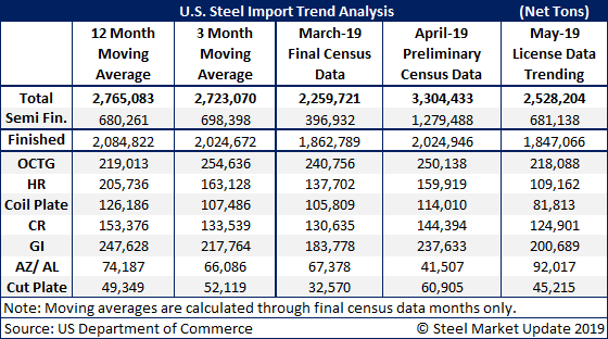 Steel imports are trending lower in May. SMU’s projection for the month based on average daily import license data forecasts total imports of around 2.5 million tons, slightly below average, as semi-finished imports return to more typical levels.