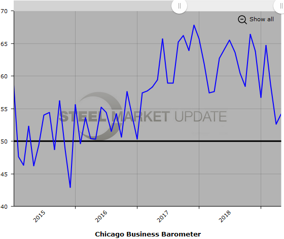 Below is a graph showing the history of the Chicago Business Barometer. You will need to view the graph on our website to use its interactive features; you can do so by clicking here. If you need assistance logging in to or navigating the website, please contact us at info@SteelMarketUpdate.com.