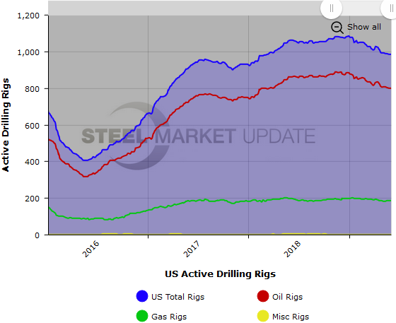 The U.S. active rotary rig count, an indicator of oil country tubular goods demand, increased this week, according to oilfield services company Baker Hughes. The number of active U.S. rigs rose by 1 to 984, with oil rigs up 3 and gas rigs down 2. Compared to this time last year, the 984 count is down 76 rigs, with oil rigs down 61, gas rigs down 13, and miscellaneous rigs down 2. See the first graph below for a history of active U.S. rig counts.