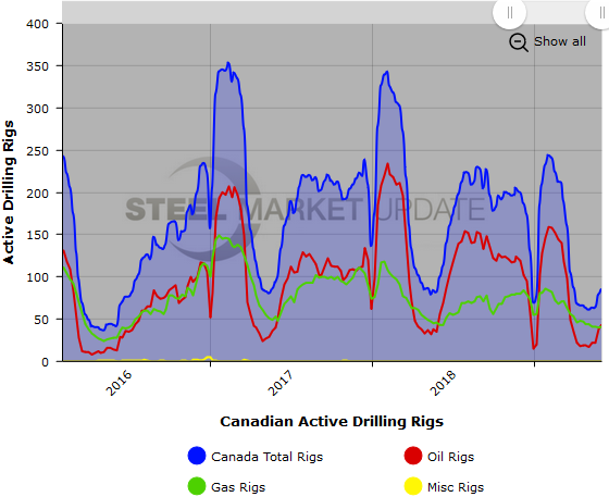 The Canadian rig count rose by 7 to 85 rigs, with oil rigs up 6 and gas rigs up 1. Compared to last year, the 85 count is down 14 rigs, with oil rigs down 12 and gas rigs down 2. See the second graph below for a history of active Canadian rig counts.