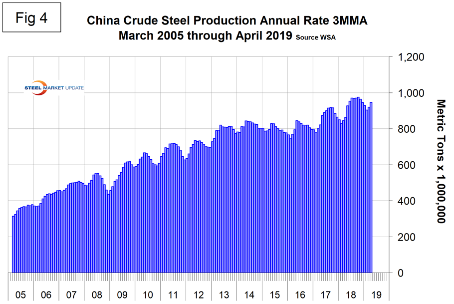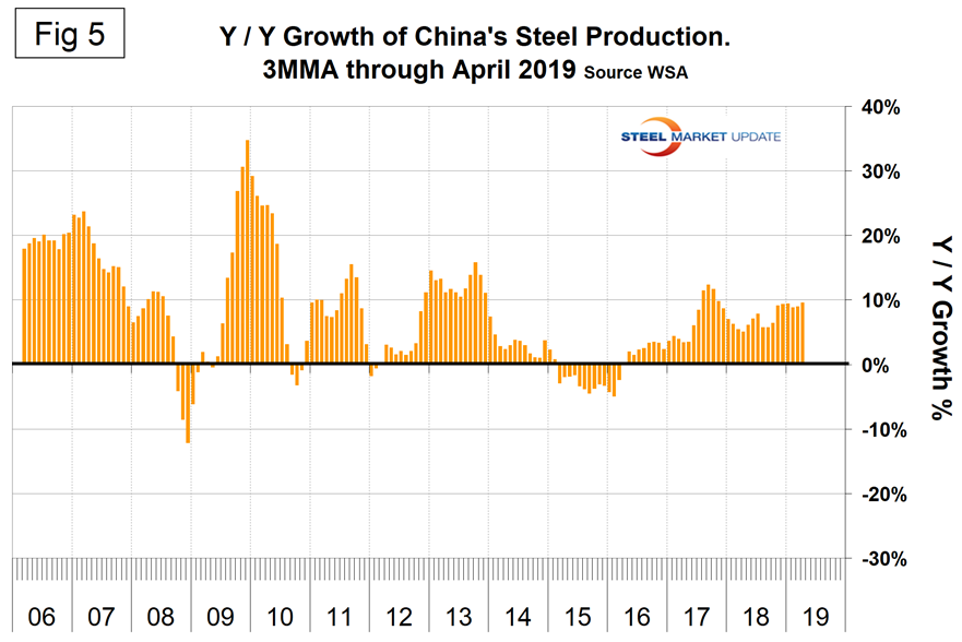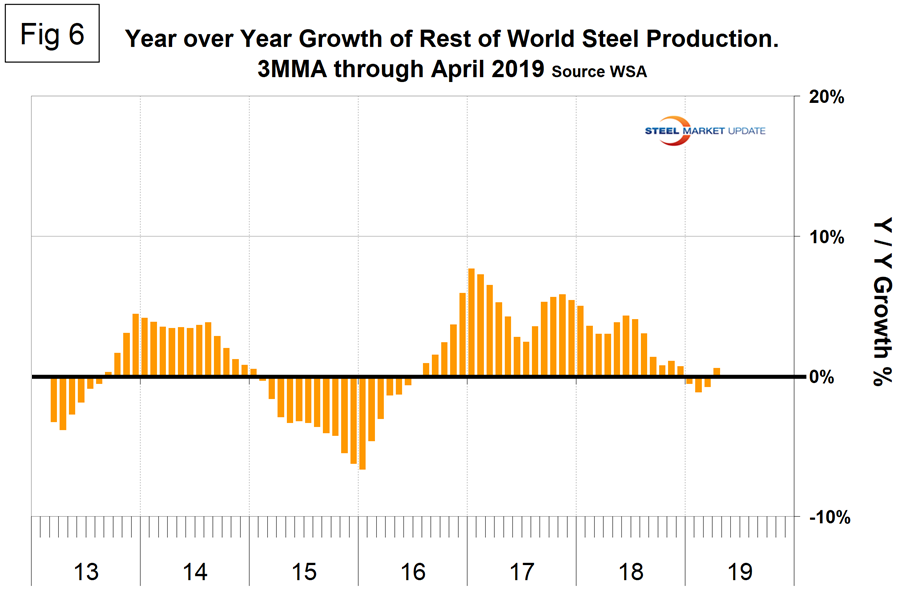 Figure 5 shows the growth of China’s steel production since January 2013 and Figure 6 shows the growth of global steel excluding China. Both to the same scale and time period. China’s domination of the global steel market is increasing and in April for the first time had an annualized production rate of over one billion metric tons. The WSA is forecasting a deceleration in China’s steel production growth in 2019. The chairman of WSA’s economics committee stated recently that China is expected to experience zero growth in 2019, down from 6 percent in 2018. This is partly a result of trade tensions with the U.S.
