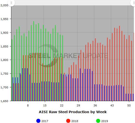 The U.S. mill capability utilization rate saw a slight dip for the third week in a row but remained above 81 percent (81.2 percent) for the week ending June 1. Raw steel production declined by 0.1 percent from the previous week to 1,890,000 net tons. The week’s production represented a 4.5 percent increase from the same period last year, reported the American Iron and Steel Institute.