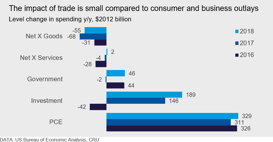 As we have noted in previous commentary, the impact of trade on the U.S. economy is relatively small, at the aggregate level. The chart below shows the y/y change in the level of spending, in real terms, by each major category of Gross Domestic Product (GDP). As we can see, the net loss to GDP from trade was $55 billion in 2018. This was only a little more, in absolute terms, than the contribution to GDP of government spending ($46 billion) last year.