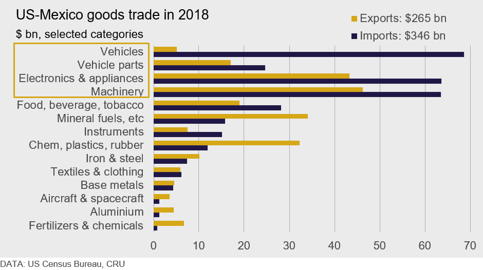 At $346 billion, Mexico provided 13.6 percent of the total value of U.S. imports in 2018; this was second only to China at nearly $540 billion. Vehicles and parts together accounted for ~27 percent of Mexican exports to the U.S. in 2018. Add in electronics, appliances and machinery, and these four sectors together account for nearly 64 percent of U.S. imports from Mexico. Conversely, these four categories, along with food, mineral fuels and chemical products, constitute roughly 65 percent of U.S. exports to Mexico.