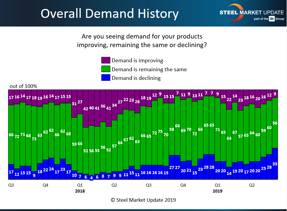 Steel Market Update data supports the widespread view that steel demand is unusually sluggish for this time of year. Nine out of 10 steel buyers responding to Steel Market Update’s market trends questionnaire this past week characterized demand as flat or declining. Only a small single-digit percentage see improving demand.