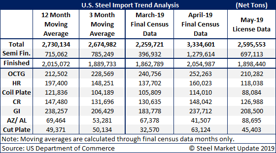 U.S. steel imports appear to have declined in May from the big jump in April, based on a preliminary total of May license data from the Commerce Department. Semi-finished imports dropped sharply, from 1.3 million tons in April to 697,000 tons in May as domestic steelmakers worked down their supplies of foreign slabs.
