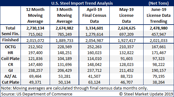 This first estimate of U.S. steel imports for June shows foreign purchases trending further downward. The rate of Commerce Department import licenses, extrapolated out through the end of the month, forecasts total steel imports of less than 2.5 million tons in June, well below the average of around 2.7 million tons.