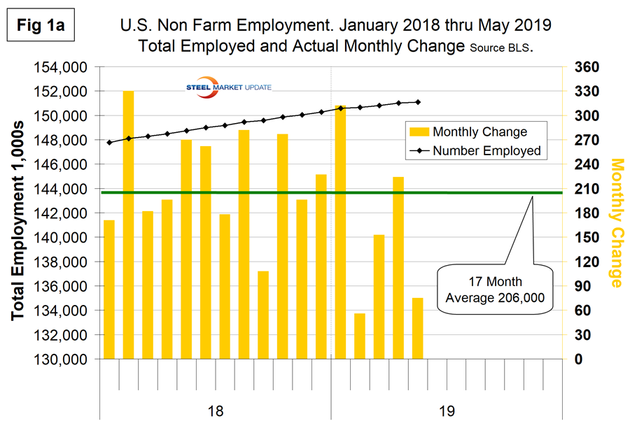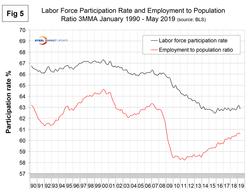 Net job creation in May was an unexpectedly low result of 75,000. To make matters worse, March was revised down by 36,000 and April was revised down by 39,000. Rising employment and wages are the main contributors to GDP growth because personal consumption accounts for almost 70 percent of GDP. Steel consumption is related to GDP; therefore, this is one of the indicators that help us understand the reality of the steel market.