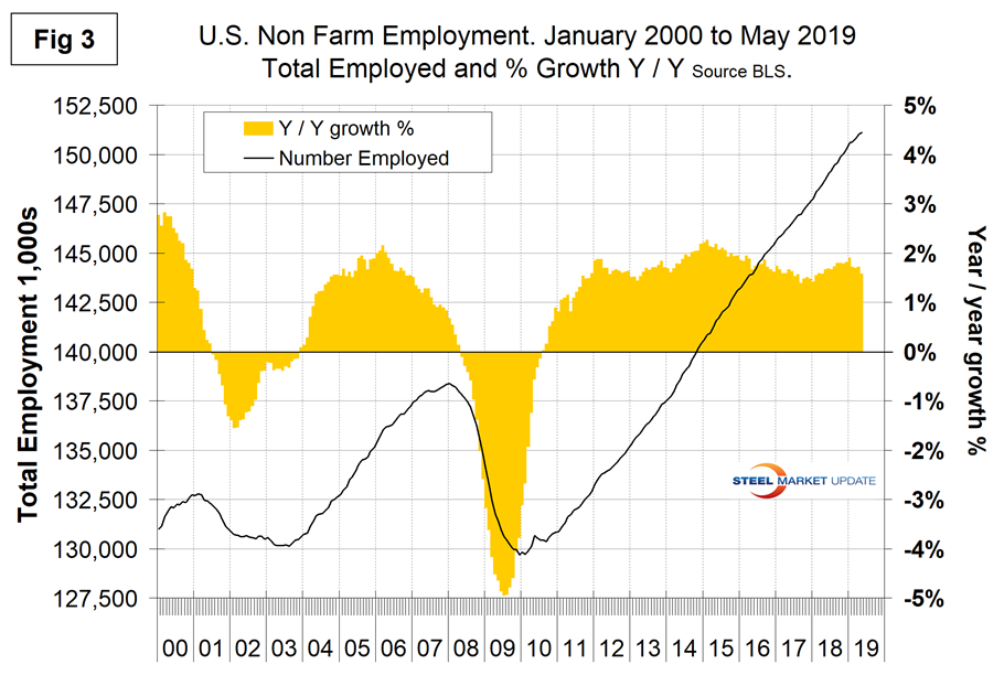 The rate of job creation in the U.S. in 2019 is slowing, according to Steel Market Update’s analysis of the latest Bureau of Labor Statistics data.