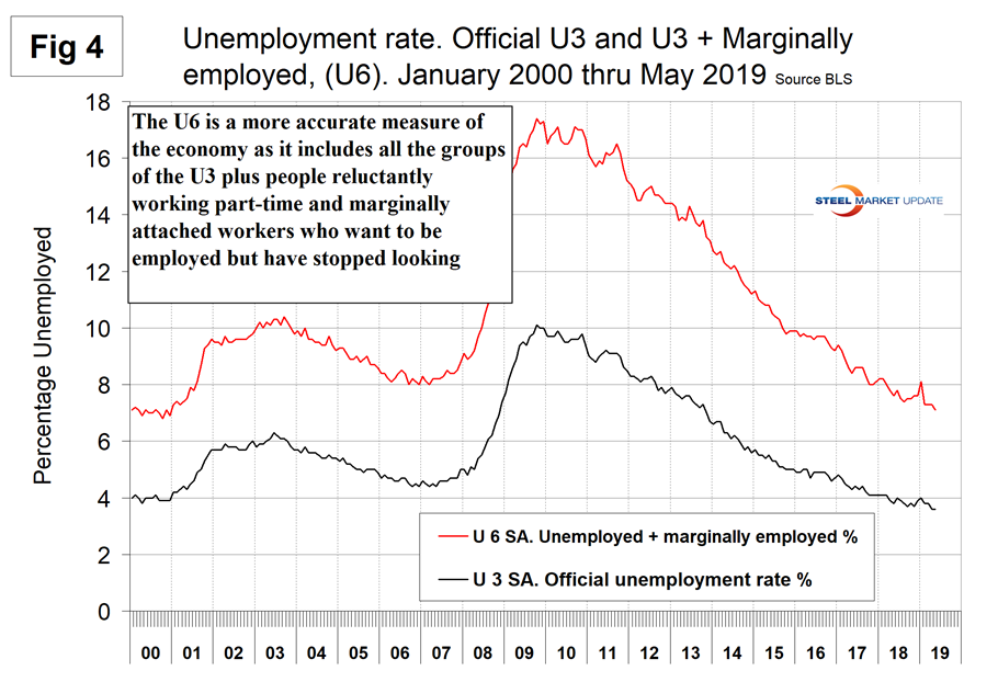 The official unemployment rate, U3, reported in the BLS Household survey (see explanation below) was unchanged at 3.6 percent in May and down from 3.8 percent in February and March. U3 has ranged from 3.6 to 4.0 percent in each of the last 14 months. This is not a very representative number. The more comprehensive U6 unemployment rate at 7.1 percent was down from 7.3 percent in February, March and April and is currently lower than at any time since December 2000 (Figure 4). The difference between these two measures in May was 3.5 percent. U6 includes individuals working part time who desire full-time work and those who want to work but are so discouraged they have stopped looking.