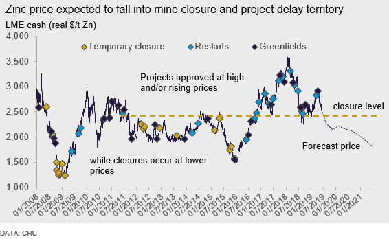 As zinc prices once more approach the level at which mine cutbacks and closures have occurred in the past, we have looked at the tonnage that is at risk from lower prices, particularly in a context of higher TCs. Furthermore, with mine supply growth for both zinc and lead beyond 2020 dependent on the development of as yet uncommitted projects, we look at the impact of lower prices on project approvals.