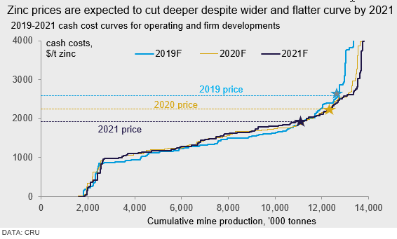 Three-month zinc prices are now approaching the $2,400/t level and CRU’s forecast sees them dropping through and remaining below that level for the next two years and beyond. While we see the bottom of the price cycle occurring in mid-2021, we expect only a fairly gradual recovery thereafter. Meanwhile, cost inflation is expected to be a key feature of the zinc market over the next few years, as the U.S. dollar begins to normalize (and weaken), energy and consumable price inflation begins to pick up, and treatment charges continue to rise as a result of growing concentrate surpluses. Thus, at the same time as prices are expected to fall, the cost curve will rise, and prices will cut deeper into the curve by 2021.
