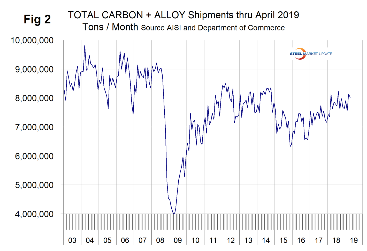 The shipments and supply report you are reading now is based on monthly shipments by product as reported by the AISI, plus import and export data from the Department of Commerce. Figure 2 shows the monthly shipment data for all rolled steel products. In the long run, the trajectories of growth in Figures 1 and 2 are basically the same.