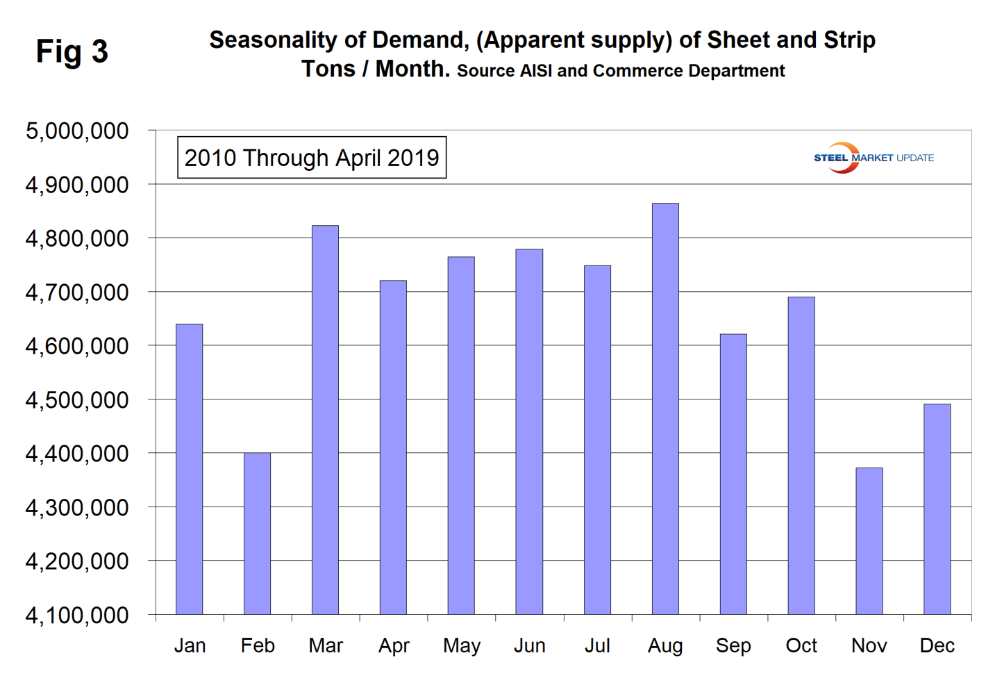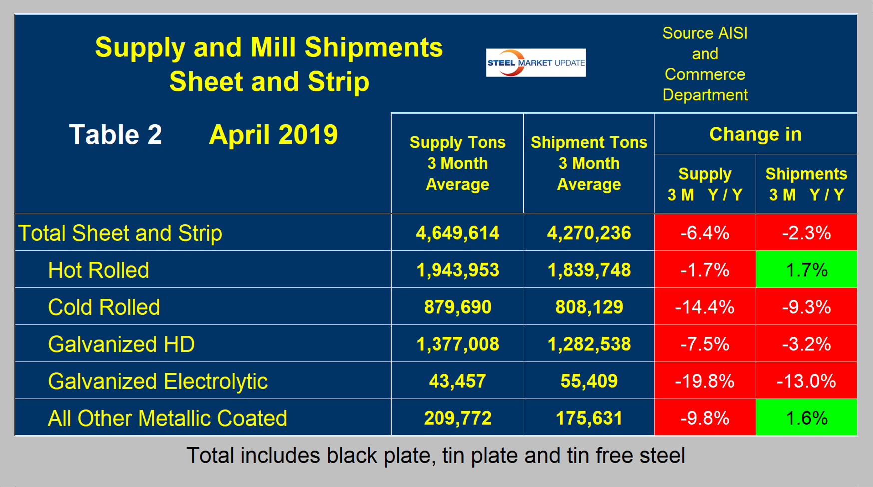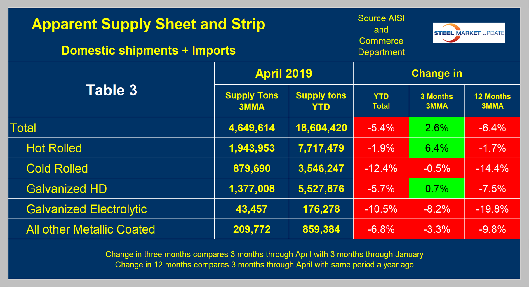 Table 2 describes both apparent supply and mill shipments of sheet products (shipments includes exports) side by side as three-month averages through April with year-over-year growth rates for each. Comparing the year-over-year time periods, total supply of sheet products to the market decreased by 6.4 percent and mill shipments decreased by 2.3 percent. Table 2 breaks down the total into product detail and shows that supply was down for all five sheet products considered in this report. Domestic mill shipments were down year-over-year for cold rolled and galvanized, but hot rolled and other metallic coated had positive growth. Apparent supply is defined as domestic mill shipments to domestic locations plus imports. In the three months through April 2019, the average monthly supply of sheet and strip was 4.649 million tons. There is no seasonal manipulation of any of these numbers. By definition, year-over-year comparisons have seasonality removed. Table 2 shows the change in supply by product on this basis through April.