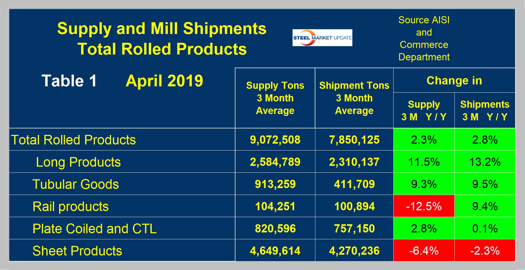 First, though, we will look at the shipment and supply situation for all product groups to see how much difference there is between them. Table 1 is this compilation. Total supply (proxy for market demand) as a three-month moving average (3MMA) was up by 2.3 percent, and mill shipments were up by 2.8 percent, meaning that imports took a smaller slice of the pie in the three months through April year-over-year. There is a big difference between products. Sheet products had a year-over-year decline in both shipments and supply. Long products had double-digit growth in both shipments and supply, and tubular goods shipments and supply were both higher than 9 percent. The domestic plate producers lost ground to imports and eked out a very small year-over-year growth in shipments.