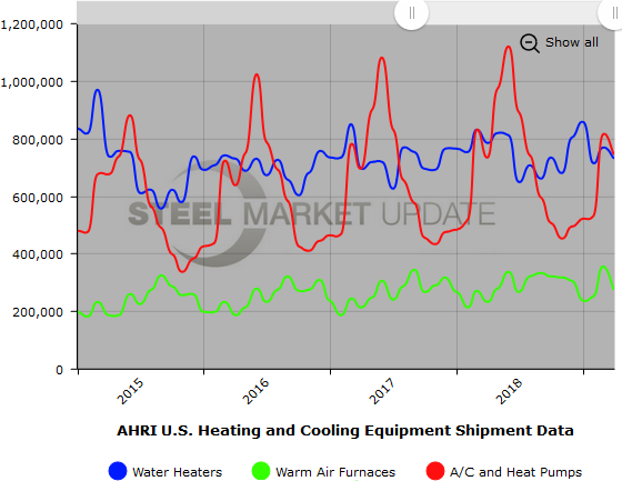 Below is a graph showing the history of total water heater, warm air furnace and air conditioner shipments. You will need to view the graph on our website to use it’s interactive features; you can do so by clicking here. If you need assistance with either logging in or navigating the website, contact info@SteelMarketUpdate.com.