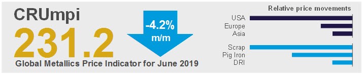 Scrap supply has continued to outpace demand in most of the key scrap supply markets and CRU’s metallics price indicator (CRUmpi) has fallen a further 4.2 percent m/m to 231.2 (see chart). This is the lowest level for the indicator since June 2017. The depth of U.S. scrap price weakness surprised the market, while seasonally softer demand elsewhere was generally the key driver of weakness. Steel market sentiment is gloomy and this is not expected to change in the near-term.