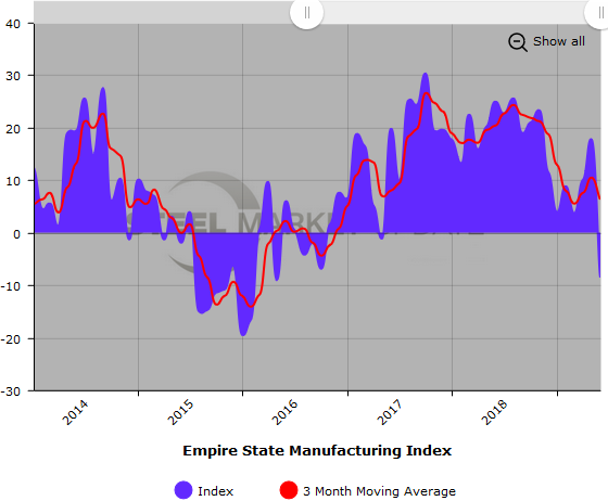 Below is a graph showing the history of the Empire State Manufacturing Index. You will need to view the graph on our website to use its interactive features; you can do so by clicking here. If you need assistance logging in to or navigating the website, please contact us at info@SteelMarketUpdate.com.