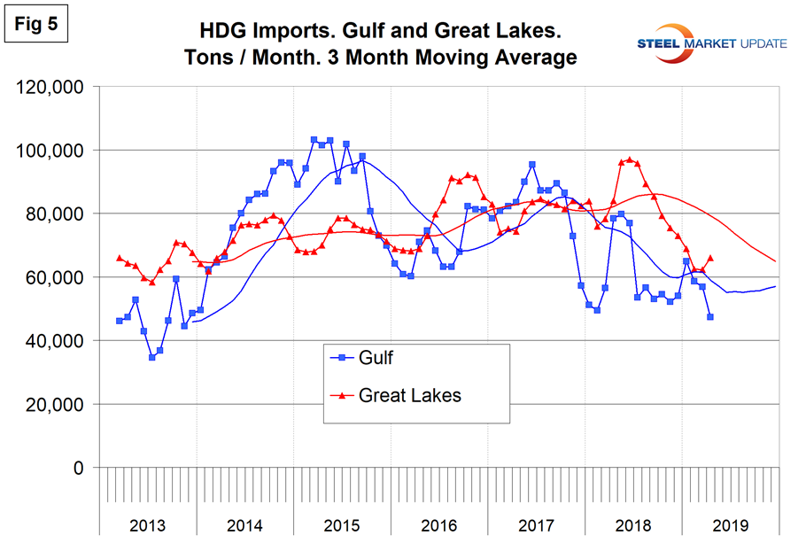 Figures 3, 4, 5 and 6 show the history of HDG coil imports by region since March 2013 on a three-month moving average basis. Note, the Y axis scales are not the same.