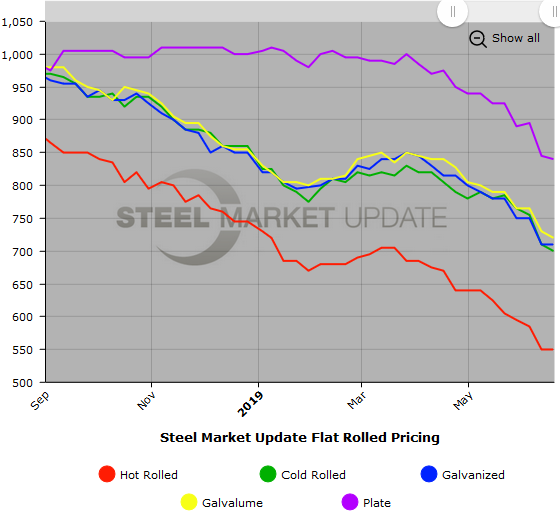 SMU Note: Below is a graphic showing our hot rolled, cold rolled, galvanized, Galvalume and plate price history. This data is available here on our website with our interactive pricing tool. Note that plate prices are not yet available on our website, but we are in the process of adding that dataset. If you need help navigating the website or need to know your login information, contact us at info@SteelMarketUpdate.com or 800-432-3475.