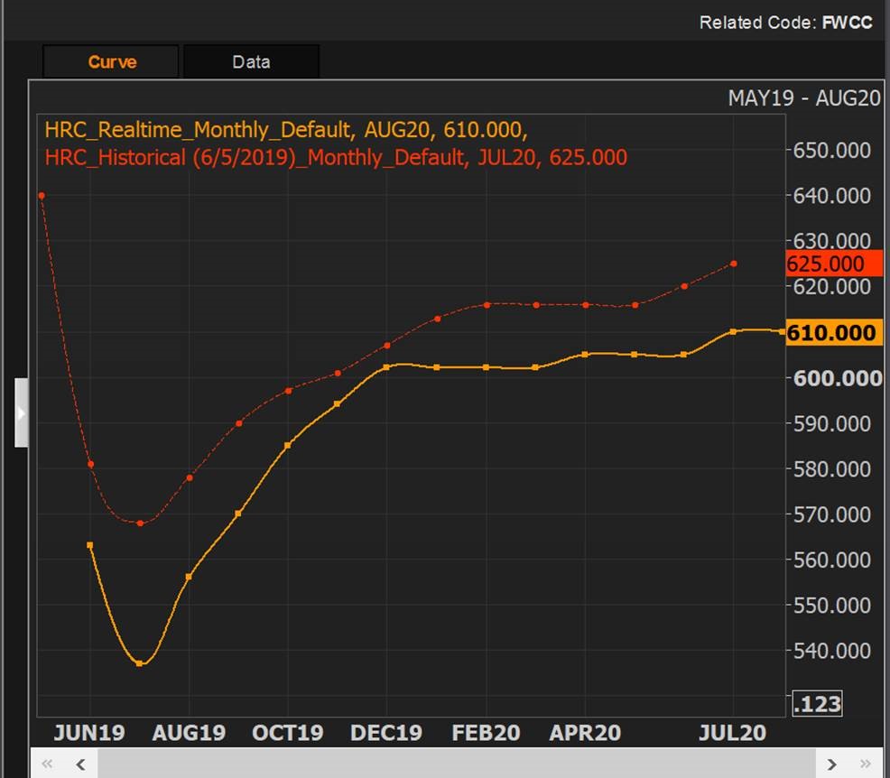 My last article was titled “Futures: A Tail of Hope.” It highlighted how the contango (a curve where the front months are cheaper than the periods further out) had gotten steep. Any such market commands a closer look for those looking at calendar spreads/hedging cheap spot buys. Yesterday the contango got steeper! Market participants had an interesting problem to solve. How to trade a sharp decline in the spot index? As the index fell sharply, reflecting physical spot market transactions, front month futures got sold down (chart below). The back half of the futures, however, were trading up day over day. There were announcements from U.S. Steel about reduction in capacity, as well as optimistic outlooks shared by a few speakers at the SSS Conf in NY. The combination of facts and opinions apparently influenced buyers to come out of hiding and bid up levels Sep’19 onwards.