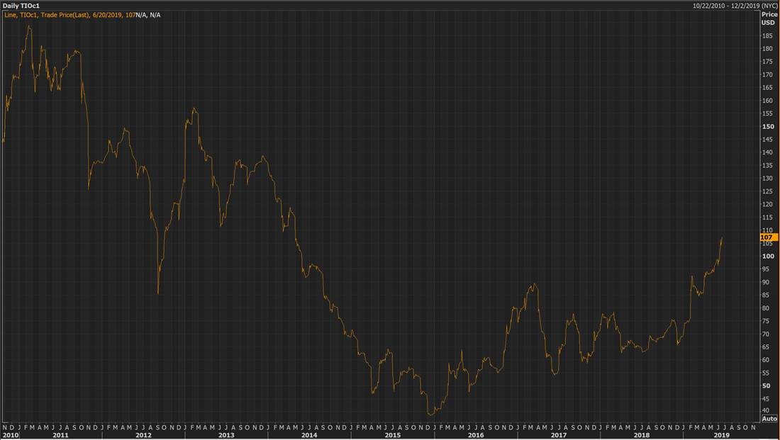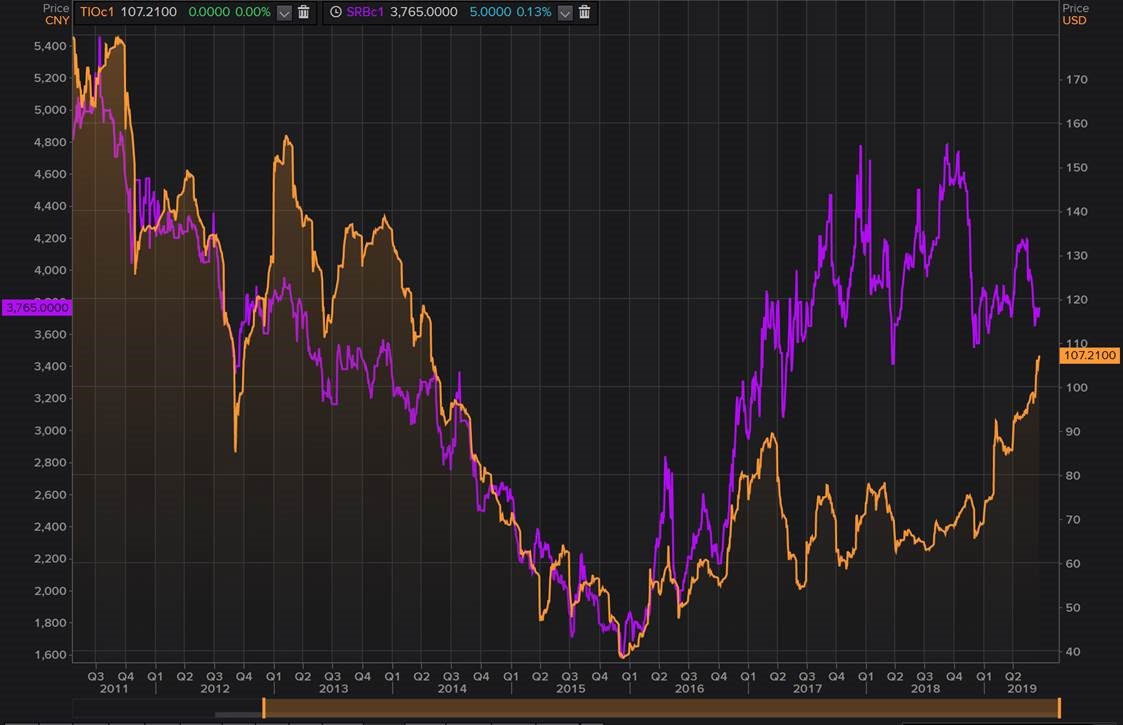 The chart above shows a steeper contango today than two weeks ago, highlighting that the market participants anticipate a rise in prices from July onwards. The pricing view in this case is likely influenced by a combination of factors: 1) expectation of reduced supply; 2) improvement in apparent demand driven by restocking; 3) and relative value of U.S. steel prices versus global pricing. Iron ore prices (chart below) have remained resilient and are trading at highs last seen in 2014. I recollect the 2014 period being a phase in the market that baffled those of us trading/originating Asian steel. The extent to which the Chinese mills were willing to drop steel prices below even the lowest estimates of cost of production was baffling to many.