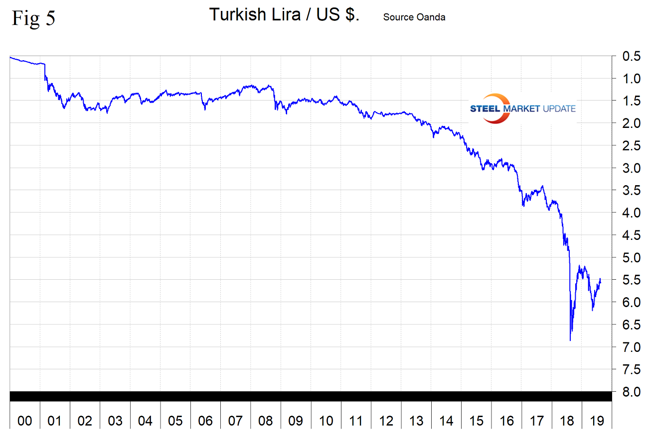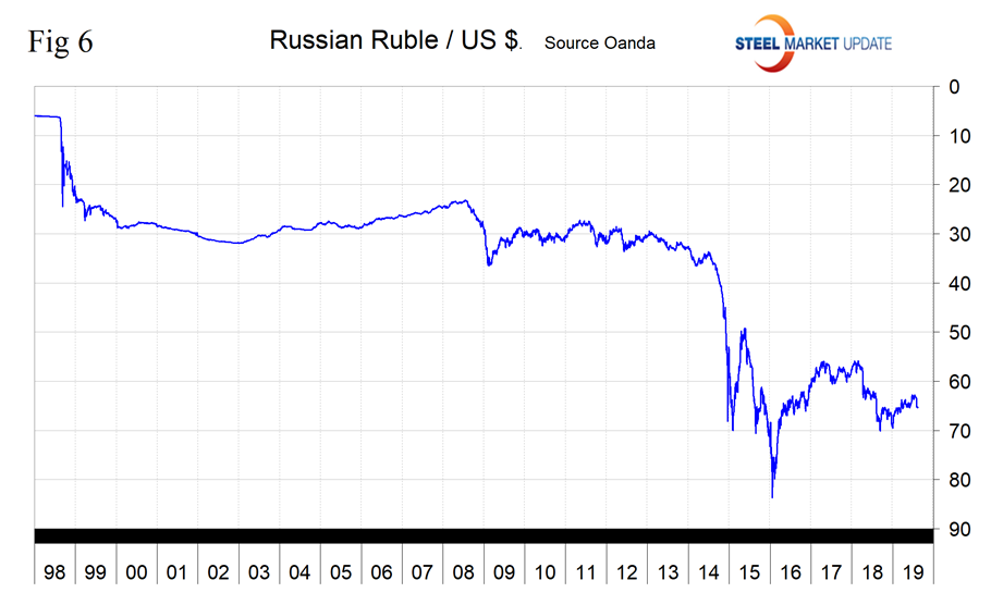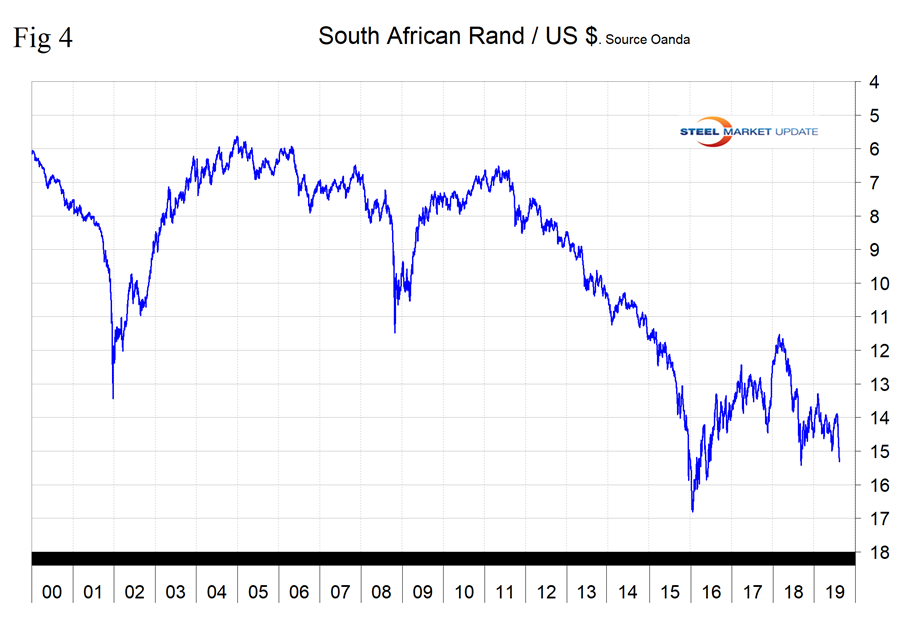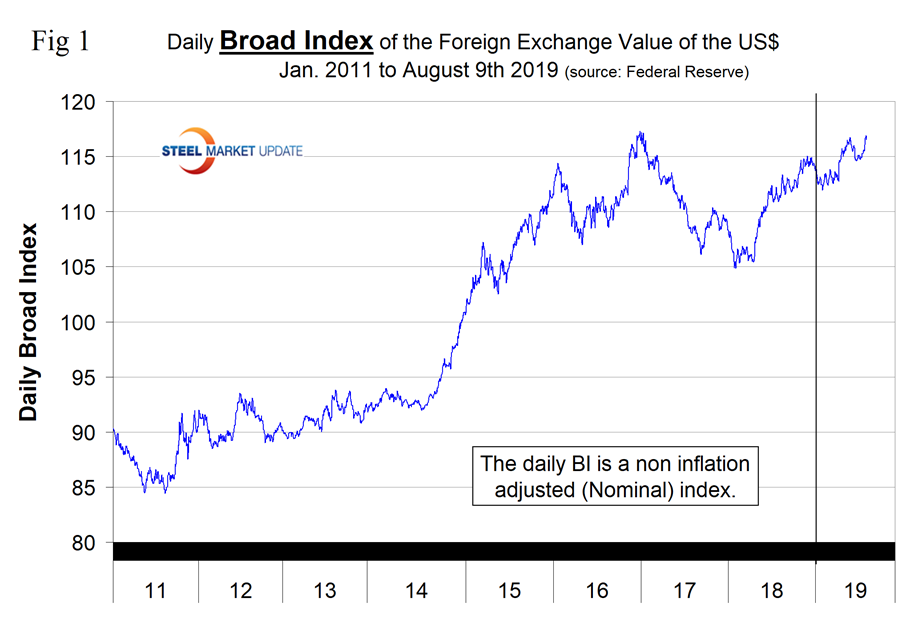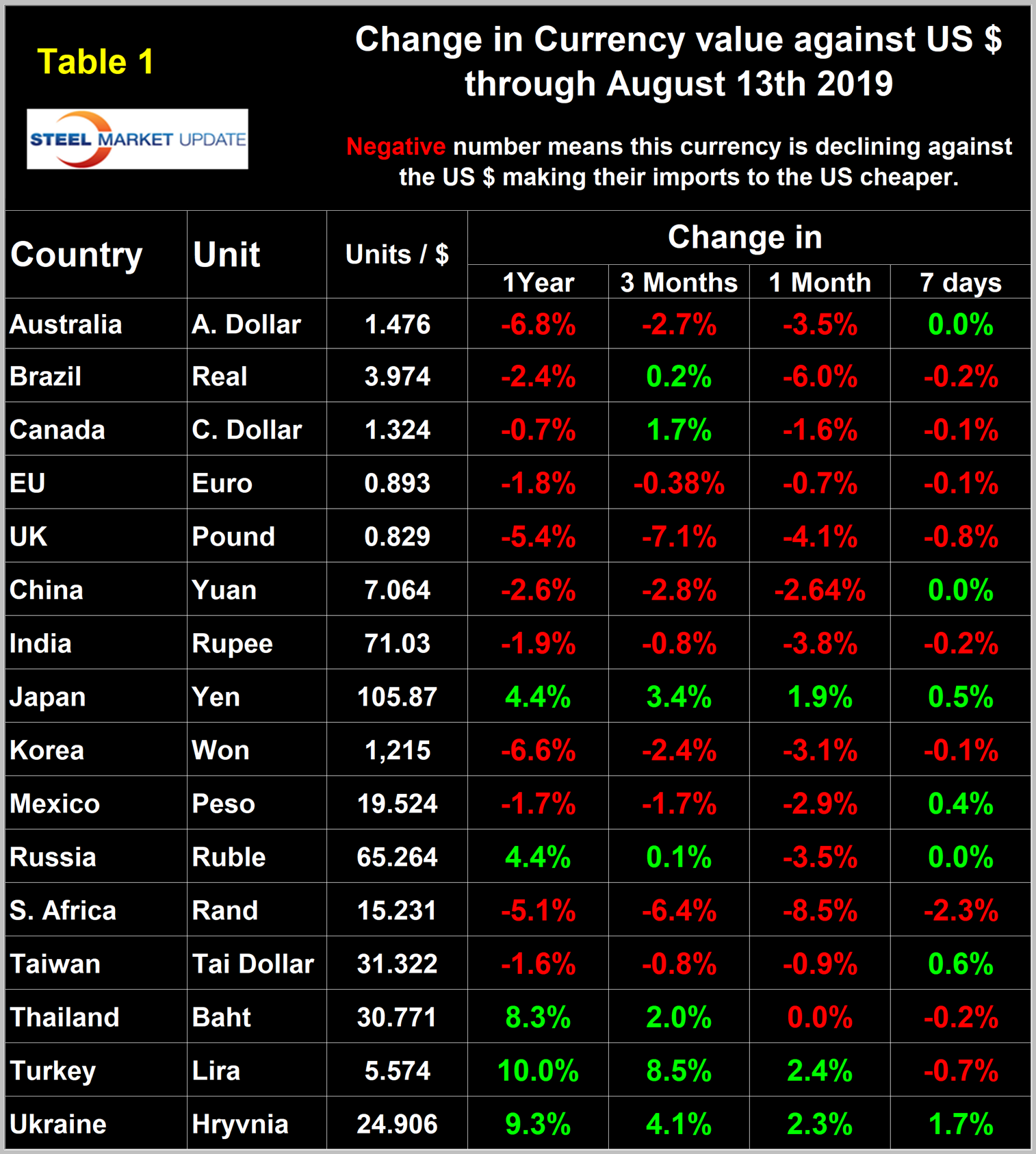 In this report we examine the change in currency values of the 16 preeminent global steel and iron ore trading nations. The currencies of these 16 don’t necessarily follow the Broad Index value of the U.S, dollar. In fact, at any given time, some are always moving in the opposite direction. The latest value of the Broad Index as published by the Federal Reserve was Aug. 9. In three months prior to that date, the dollar had strengthened by 0.2 percent and by 1.4 percent in the previous 30 days.