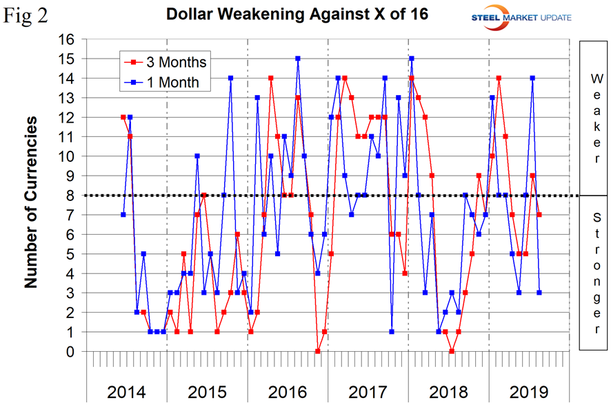 The U.S. dollar has strengthened against 13 of the 16 steel trading nation currencies in the last month.