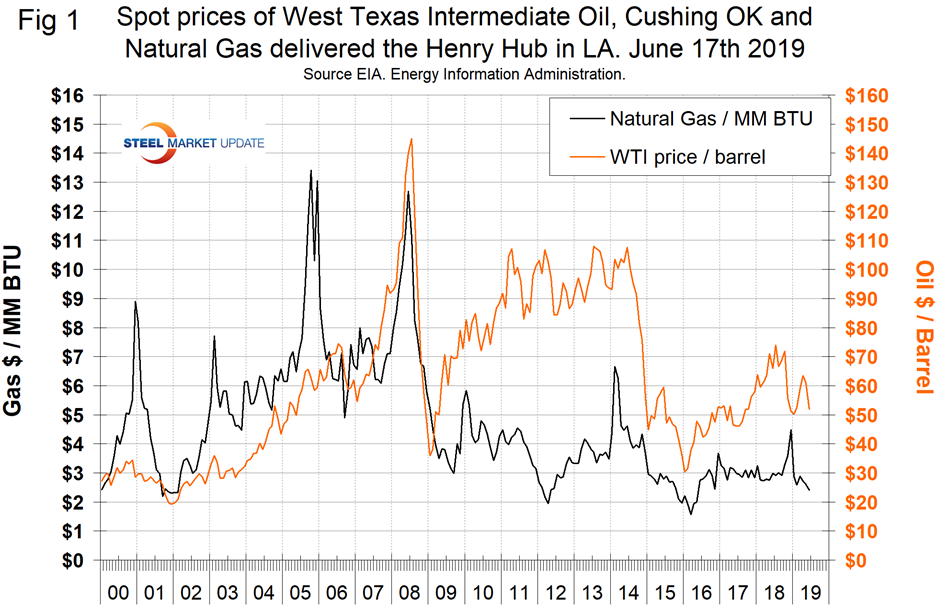 Figure 1 shows historical oil and gas prices from January 2000 through June 17, 2019. Our price and inventory data come from the Energy Information Administration (EIA). On June 14 (latest data available), natural gas at the Henry Hub in Oklahoma was priced at $2.41 per MM BTU, down from $3.50 on Jan. 25.