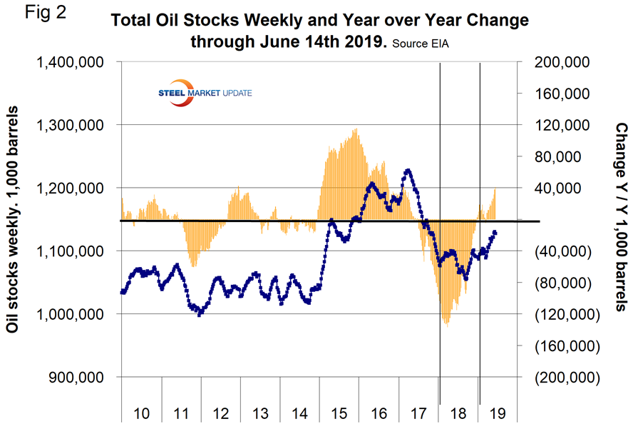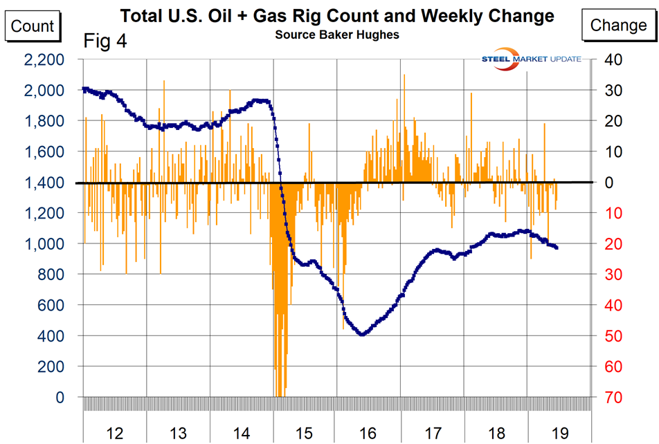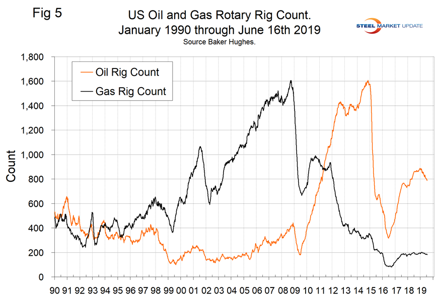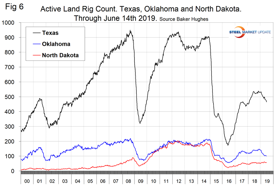 The spot price of West Texas Intermediate (WTI) FOB Cushing, Okla., reached $66.24 per barrel on April 20 and had declined to $51.94 on June 17. The total number of operating rigs exploring for oil has declined by 106 since Jan. 4. The prices of oil and natural gas drive the consumption of energy-related steel products including oil country tubular goods, pipe fittings and well head equipment, among others. Welded tubular goods (not including OCTG) consumed about 5.5 million tons of hot rolled sheet in 2018.
