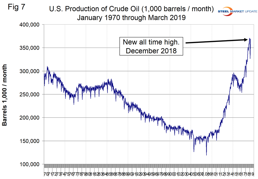 Figure 7 illustrates the monthly U.S. oilfield production of crude from January 1970 through March 2019 (latest data available) in thousands of barrels per month. The historical high was October 1970 at 310.4 million barrels. Production steadily declined to half that level in the late 2000s before the fracking revolution. December 2017 broke the record that had stood for 47 years with 310.7 million barrels produced and December 2018 set a new record at 370.8 million barrels. March 2019 at 369 million barrels saw a recovery from the 327 million barrels produced in February.