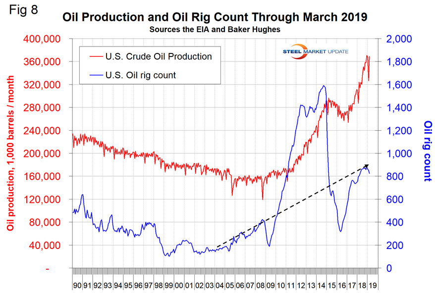 Figure 8 compares oil production and the oil rig count and shows how the increase in exploratory wells drove production from 2009 through late 2014 when the oil price collapsed. Rig count and production have declined in synchrony in 2019.