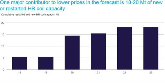 In total, some 18-20 Mt of new or restarted hot strip mill capacity, for instance (see chart), has been identified to be in place by 2023, and this is a major contributor to our forecast of lower prices over that timeframe. Moreover, sheet prices are falling back towards their historic premium over global prices, without regard to S232, which we assume remains in place over the period. Clearly its removal provides further downside risk to prices.