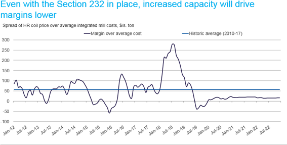 What at first sight appeared as a leg-up to domestic steel producers – S232 – may well have had the unintended consequence of weakening the U.S. market in the longer term through encouraging home-grown oversupply. While not all the intended new capacity is a direct result of S232, nor may all of it come to fruition, all forecast scenarios point to weaker mill margins and lower steel prices in the period to 2023.