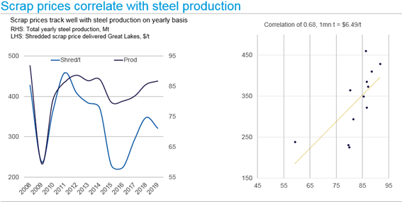 There are other consequences of growth in domestic steelmaking capacity beyond deterioration in the finished steel supply/demand balance. Our analysis shows that U.S. scrap prices are reasonably well correlated to U.S. steel production levels (see chart). This is because higher steel output means higher scrap demand and an increase in both intra- and inter-regional competition for scrap.