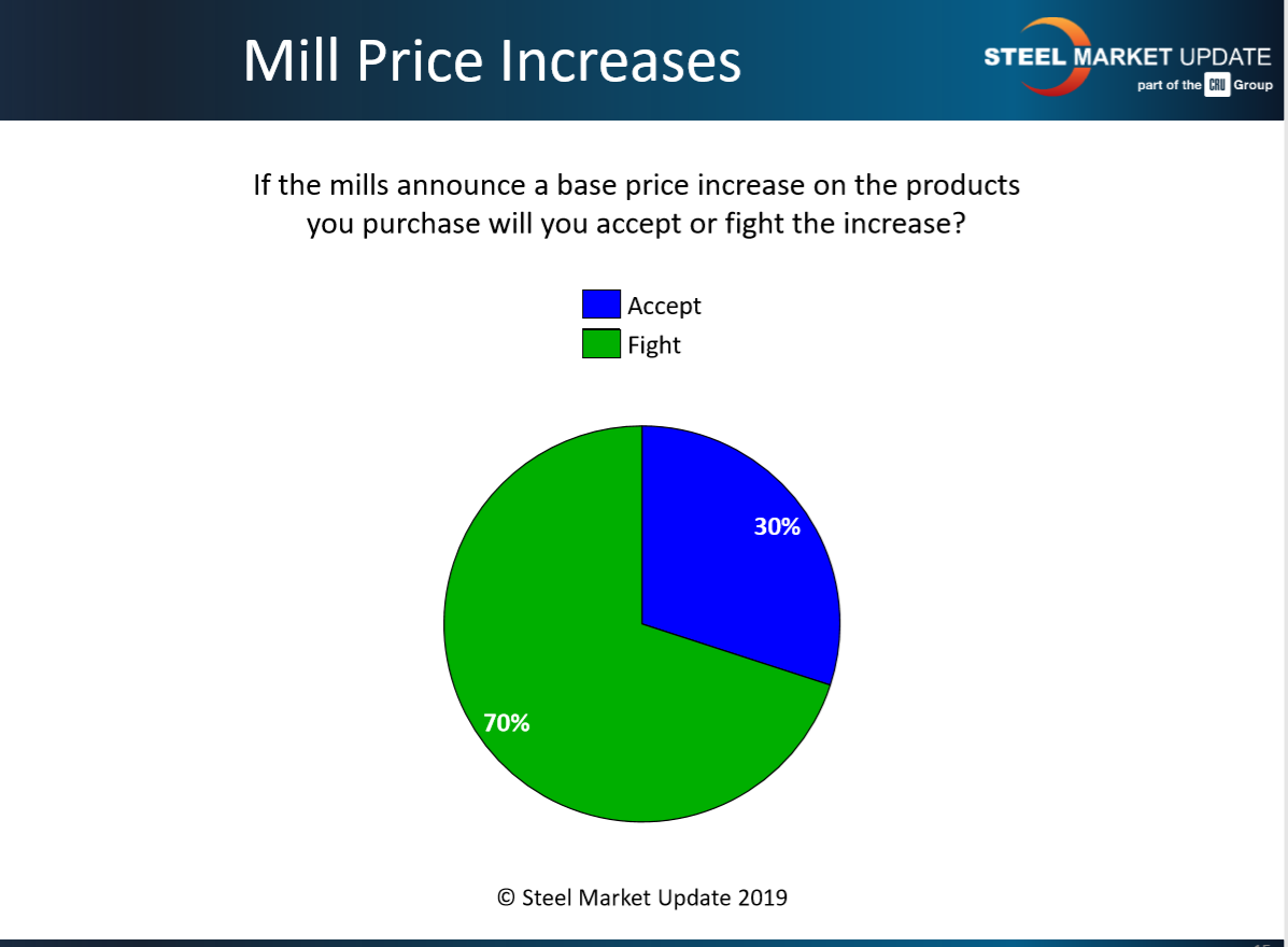SMU also asked: If the mills announce a base price increase on the products you purchase, will you accept or fight the increase? Seventy percent of respondents said they would fight it.