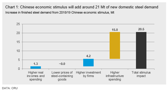 Chinese economic stimulus in 2018 and 2019 will add a total of 21 Mt to Chinese domestic steel demand, most of which is expected to manifest in 2019. Together with stronger demand in H1 due to higher construction activity than expected, this will mean domestic steel demand will grow over 3 percent in 2019.