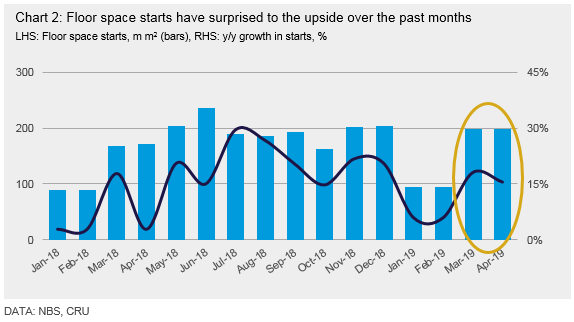 Most of the overall 20.5 Mt uplift now factors in our forecast for 2019 and represents over half of the upgrade in steel demand in our base case projections for the year. We now expect total steel demand of around 816Mt in 2019, up 3.2 percent on 2018. What else has changed? A stronger real estate market and reported steel output in Q1.