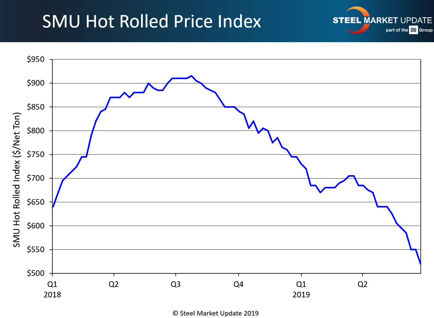 The benchmark price for hot rolled steel has declined by around 40 percent since peaking at $910 per ton last July. Steel Market Update data shows the current average hot rolled price at around $520 per ton. SMU has moved its Price Momentum Indicator from Lower to Neutral until the direction of steel prices becomes clear.