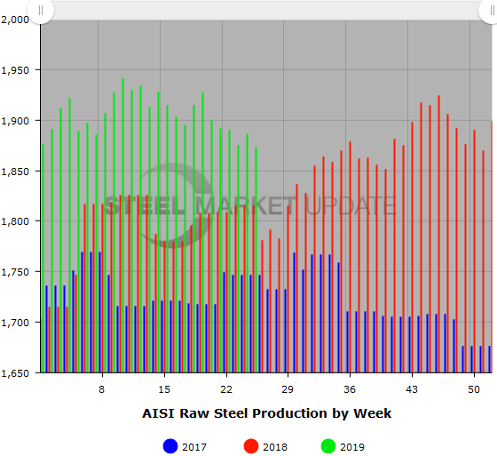 The American Iron and Steel Institute reports that raw steel production for the week ending June 22 totaled 1,873,000 net tons, a 3.2 percent increase from the same period last year. The mill utilization rate was 80.5 percent, down from 81.1 percent the prior week.