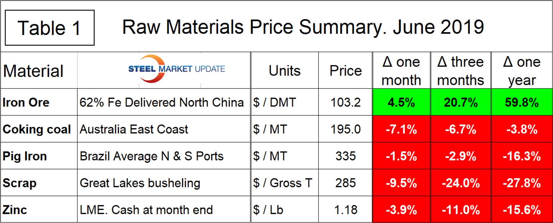 Table 1 summarizes the price changes through June of the five materials considered in this analysis. It reports the month/month, 3 months/3 months and 12 months/12 months changes and tells us that iron ore and scrap have moved in opposite directions this year and coking coal, pig iron and zinc prices have declined in all three time frames.