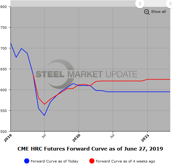 Certainly, the forward curve reflects some expectation of a healthy price bounce. Yesterday, the Aug’19-Dec’19 futures strip traded at an average price of $600/ST, which represents an $85-95 premium over this past week’s HR spot indexes. Today, Sep’19 HR futures were bid $587/ST, which reflects a steep premium to HR spot just over $500/ST. However, the contango from Jul’19 HR future (spot plus one month) to Jun’20 HR future has remained fairly steady at $53-$58/ST.