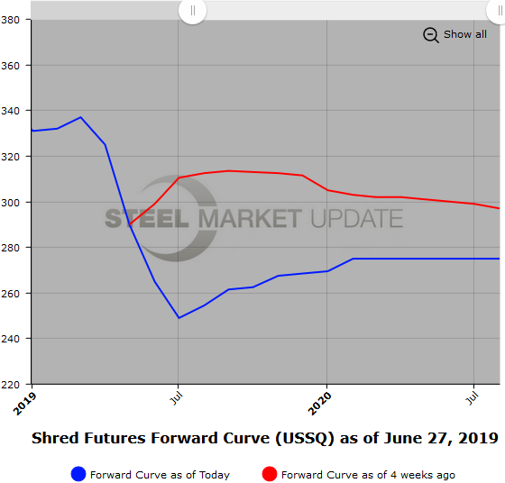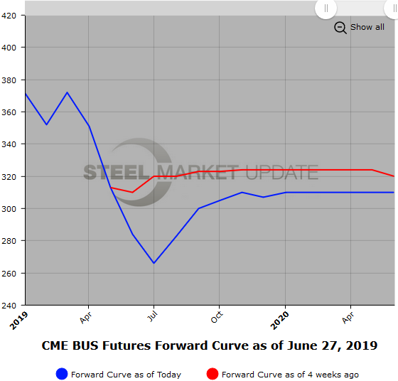Initial discussion had Jul’19 BUS declining about $30/GT, but recent comments suggest that might come in a bit. Jun’19 BUS settled at $281.73 and the latest Jul’19 future traded at $266/GT. Current offers in Jul’19 BUS only reflect a $10-$12 discount to Jun’19 settle. The futures curve has shifted lower since the end of May, with 2H’19 BUS down on average $33/GT and the 1H’20 BUS prices down on average $17/GT. However, the curve remains upward sloping the further forward you go into the future. The Jul’19 BUS to Jun’20 BUS contango is about a $45 premium. With the recent steep scrap price declines, we have observed more buyers asking for offers along the BUS curve. The HR versus the BUS spread has been running from $290 to $310 for the Q3’19 through Q1’20, but has been less active at these lower levels with fewer interested sellers.