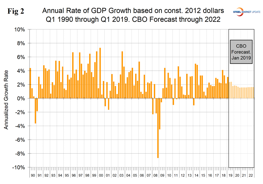Figure 2 shows the headline quarterly results since 1990 and the January 2019 Congressional Budget Office forecast through 2022. The CBO underestimated the growth rate in Q1 2019 and expects the boost from the tax break to decline by Q3 2019.